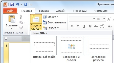 Для додавання нового слайда до презентації необхідно виконати Головна - Створити слайд. У списку кнопки Створити слайд перераховані шаблони слайдів різних типів. До списку кнопки Створити слайд включено також і порожній слайд.